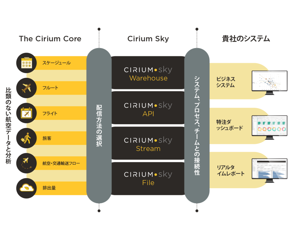 Cirium SkyTMのソリューションは、フライト、航空会社のスケジュール、機材フリート、旅客輸送、航空データ、CO2排出量データへのクラウドベースのアクセスをご提供。