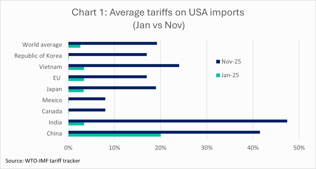 WTO-IMFの関税トラッカーによると、2025年における米国の世界からの輸入品に対する平均関税率は7倍に上昇し、1月の2.6%から11月初旬には19.2%にまで達しました。米国が主要な貿易相手国すべてからの輸入品に対する関税を引き上げた(チャート1)ことにより、この動きはこれまでに2.7兆ドル以上の貿易額に影響を与えています。