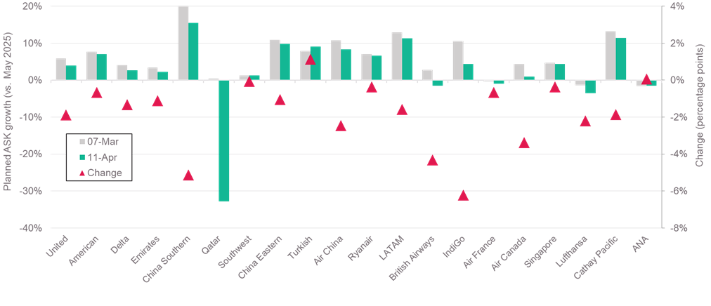 3週間前、Ciriumの2026年4月の将来運航スケジュールデータは、紛争開始直前の5.4%増と比較して、ASK(有効座席キロ)で前年同月比3.4%の成長を示していました。2026年5月については、計画されたキャパシティ(提供座席数)は6.6%から6.3%へとわずかに低下していました。