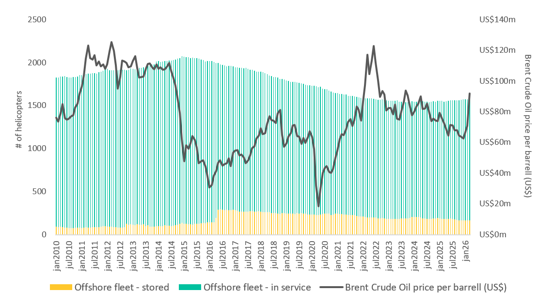 地政学的な紛争とそれに伴う原油価格の変動により、2014年に経験したような下振れへの懸念が再燃しています。しかし現時点では、短期的な価格変動だけでヘリコプターのフリート動向が実質的に変わることを示す根拠は限られています。