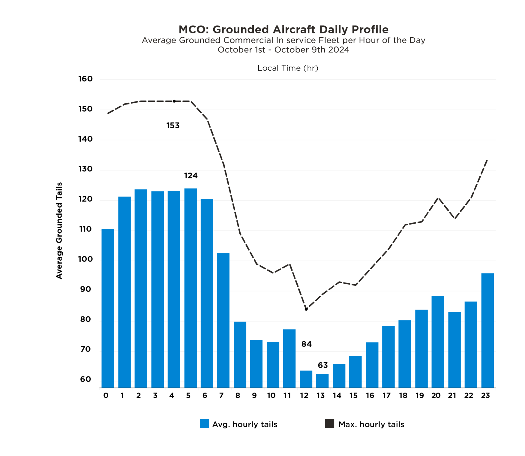 During the first week of October 2024, MCO displayed a fairly typical daily pattern of aircraft ground accumulation. The average peak accumulation occurred around 05:00 local time, with 124 aircraft on the ground ahead of the first wave of morning flights, peaking at 153 on October 6th. Conversely, the average minimum accumulation was recorded around 13:00 local time, with an average of 63 aircraft on the ground. This lull follows the morning departures and precedes the arrival of afternoon incoming flights.