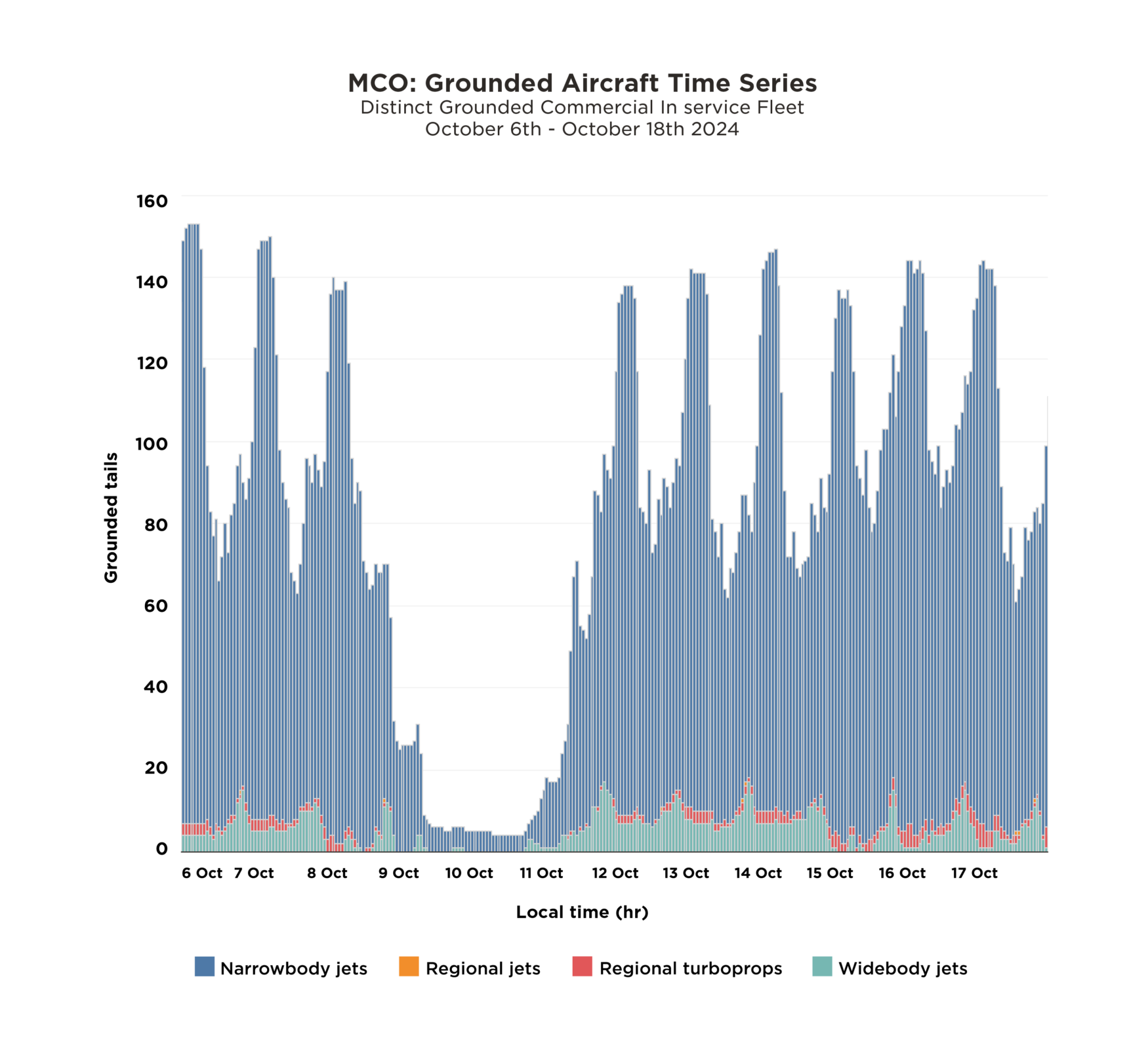 However, a small population of aircraft remained at MCO as it closed during the storm. Approximately 8-10 narrowbody jets stayed at the airport as the hurricane passed through. Despite some minor damage to facilities, the airport reopened to arrivals on the evening of 10th October, and aircraft quickly returned. Full commercial passenger operations resumed the next day and the daily ground accumulation profile returned to normal one day later on the 12th.