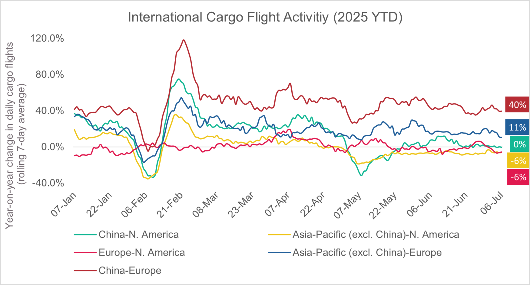 Based on Cirium’s year-to-date cargo flight data for 2025 across the major cargo traffic lanes, we observed a sharp decline in flight activity around February, coinciding with the announcement of new US tariffs. However, flights rebounded quickly as carriers employed front-loading strategies to mitigate tariff impacts before the initially announced effective date in May 2025. The latest data indicates that routes connecting to North America have been the most significantly affected. Unlike passenger flights, cargo operations are more flexible and responsive to market changes. As such, we anticipate continued in-time adjustments in cargo flight schedules in response to tariff developments. However, when and how future tariff issues will be resolved is still unclear at present.
