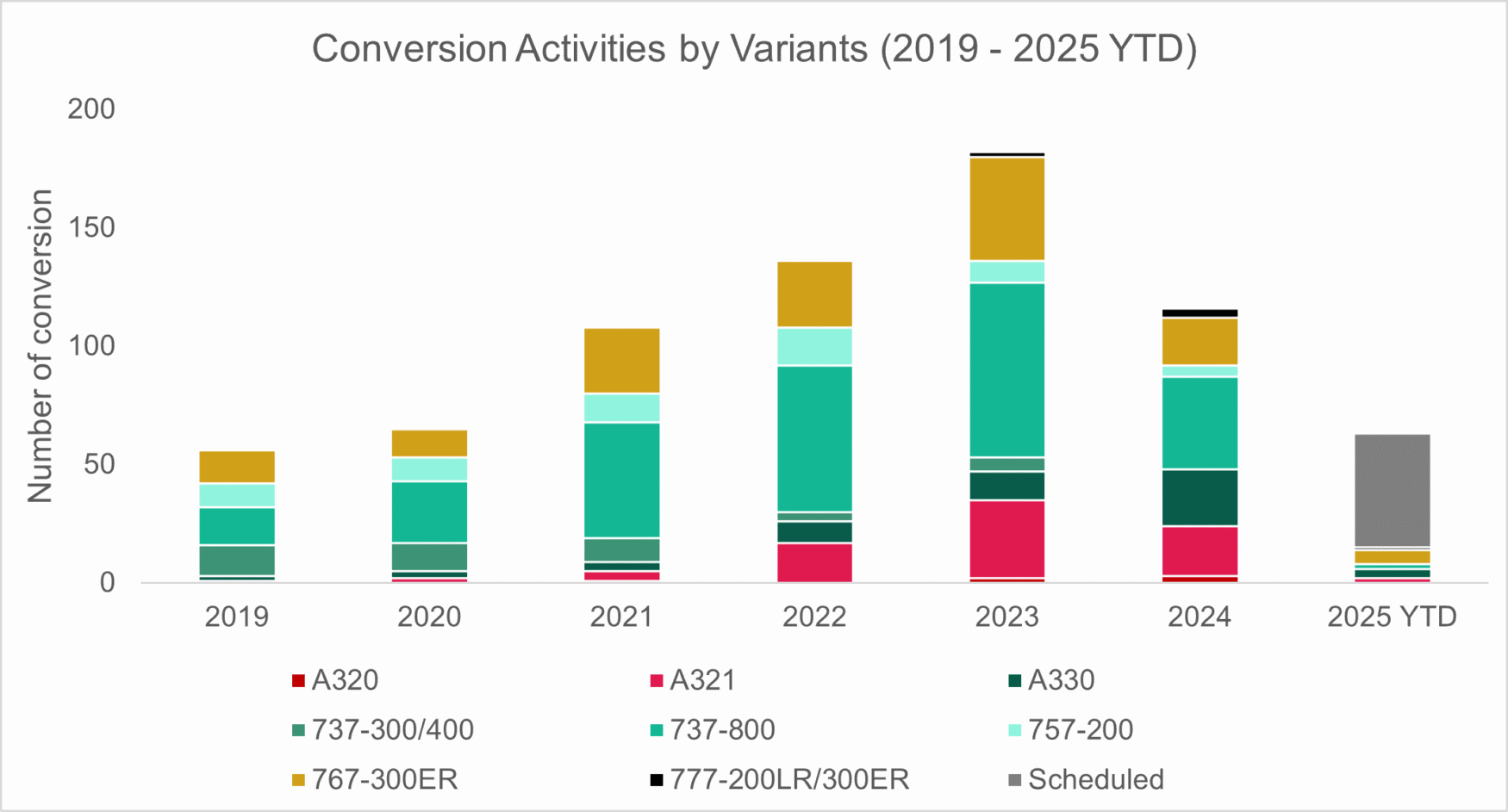 On the factory-built freighter side, about 25 new freighter orders have been placed so far in 2025, mostly for the Airbus A350F and Boeing 777-200LRF. Qatar Airways has placed the largest order for the upcoming 777-8F, while the Airbus A350F has attracted a broader customer base, including lessors. With production of the Boeing 767 and 777 set to end in 2027 and current order slots likely sold out, the market may face a potential supply shortage. Ongoing OEM delivery delays and uncertainty surrounding Boeing 777X certification could further contribute to the anticipated production gap in the short to medium term.