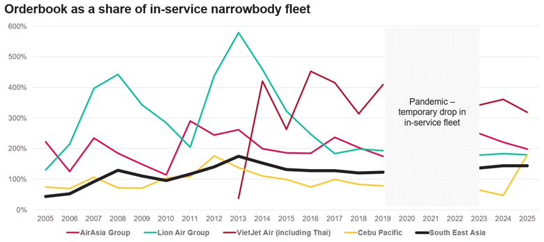 Southeast Asia is not the only place with a very large narrowbody jet orderbook as a share of in-service fleets. India, Saudi Arabia and Hungary (home to Wizz Air) stand out with orderbook shares at over 200%. It can be argued these have growth potential in different ways, but the ULCCs of Southeast Asia appear to have over-ordered given the trend of the last decade.
