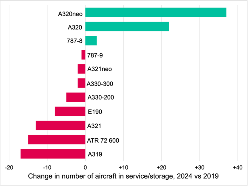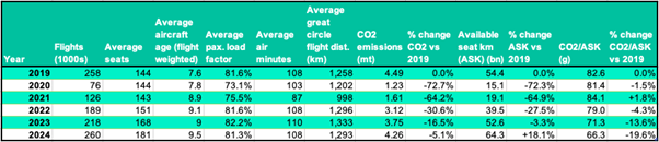By 2024 Avianca had restored its flight activity to the same level it operated in 2019. The difference is that the airline generated far more capacity because it was flying larger aircraft and flying them slightly farther on average. The removal of turboprop flying also meant that flight time did not materially increase even as stage length grew.
