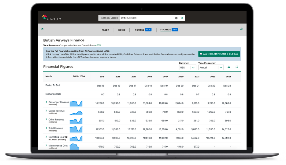 Clients already subscribing to both Cirium’s Airline Profiles and Airfinance Global’s Airline Intelligence can access this integrated feature immediately using their existing login credentials.
