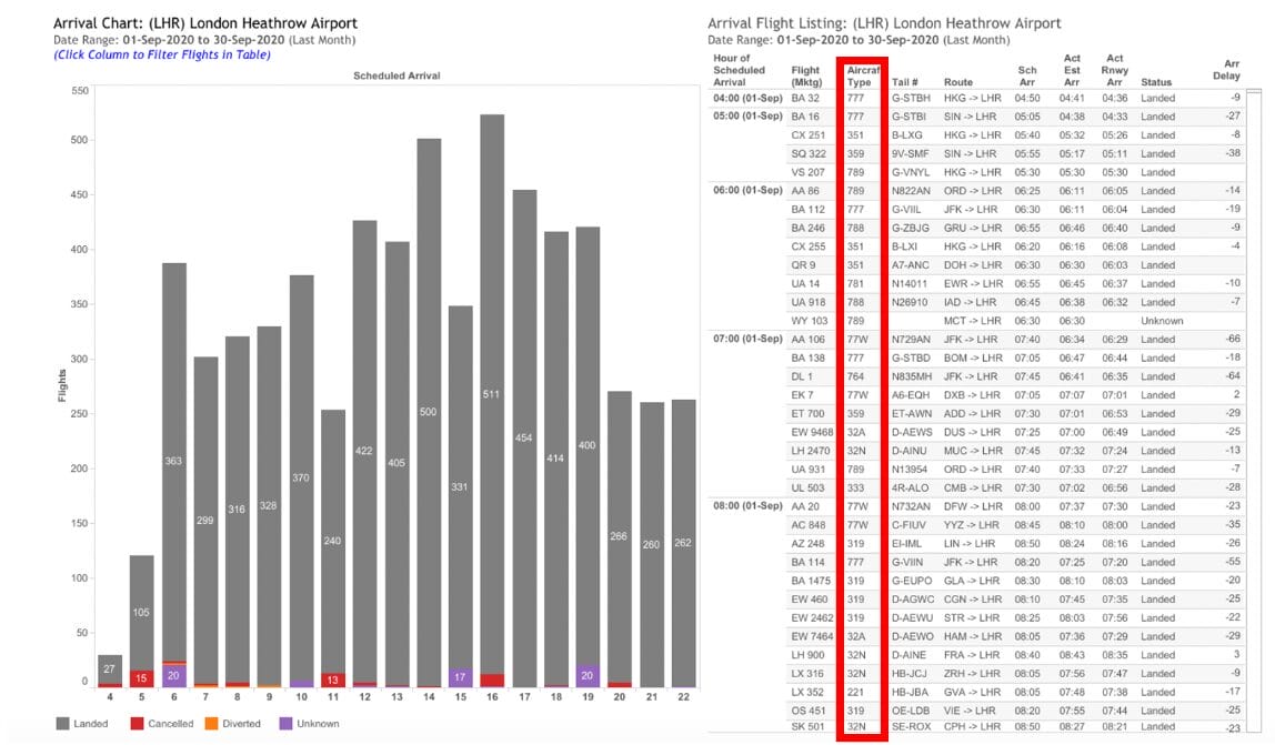 Cirium’s Arriving/Departing Flights dashboard shows historical flights flown in or out of a specific airport. User may refer to graphical bars charts on this dashboard to understand the number of flights arriving/departing at the airport, broken down by hours of the day across a date range. Each bar also indicates the breakdown of flights that have landed, cancelled, diverted, etc., which are color-coded. To find greater flight detail, users can refer to the table list on the right of the dashboard which includes details such as flight number, tail number, scheduled departure/arrival time, estimated or actual departure/arrival time, delays, and, more importantly the actual aircraft equipment used for the flight (highlighted in the red box below). This is extremely useful to airports in determining the total weight of the each aircraft that landed at their airports.