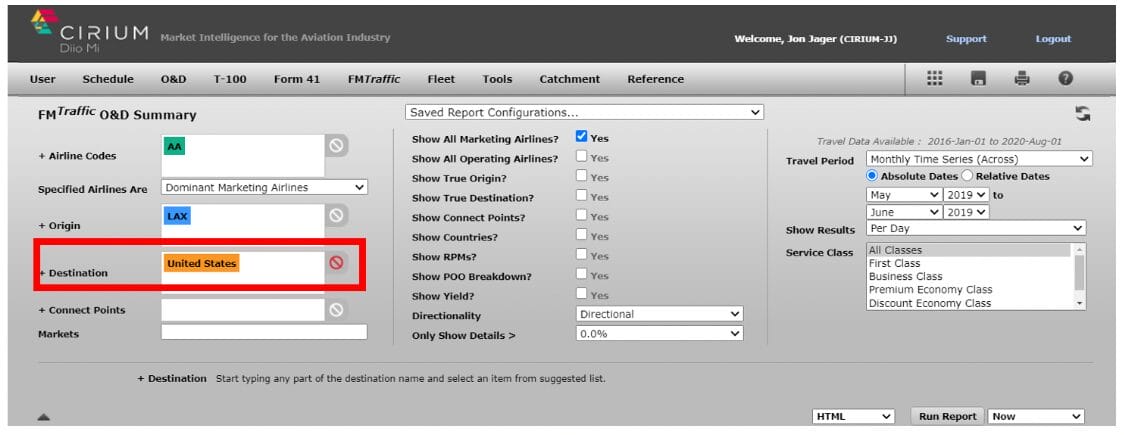 The Solution: Cirium can deliver airport historical scheduled and traffic information to use as an input into expansion planning. Using Cirium’s FM-Traffic database, the user can look at historical trends of carriers flying into the airport, going back to 2014, broken down by airline, passenger share, pax volumes in/out of any specific airport among other granular points via the O&D report and selecting the ‘Annual Time Series’ for the travel period. Using this information, lounge operators can make assumptions as to the demand of airport facilities such as the terminal and gates. Users can also determine how long and what kind of material to use to construct and expand the runway and apron, to accommodate larger aircraft.
