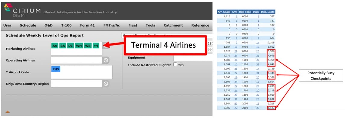 A little bit of research tells us that American Airlines, British Airways, Condor Airlines, Southwest Airlines, Volaris, and WestJet operate at Terminal 4, with a number of other airlines operating from Terminal 3. The user of the Level of Ops report can easily filter for airlines in Cirium SRS Analyser or Cirium DiioMi and find potential “busy times” in each terminal. The below example will give those staffing checkpoints in Terminal 4 an idea of when they may expect longer lines—unless they staff to appropriately handle the crowds.