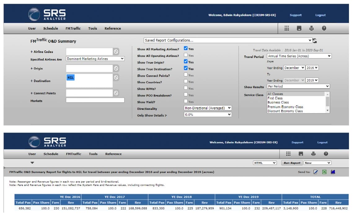 The data pull shown below sorts out passenger numbers flying into an airport since 2016 (Kigali International Airport-KGL, in this case). This historical yearly trend analysis can help to forecast passenger numbers into KGL for the next 5 years ahead.