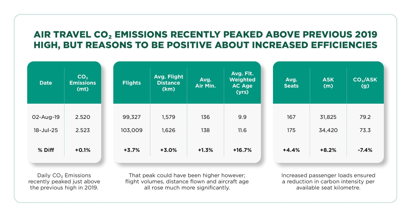 Here’s what makes July 18 significant: airlines delivered 8.2% more ASKs than August 2, 2019 while increasing total emissions by just 0.1%. Flights crept up only 3.7% over six years, yet carriers found ways to accommodate surging demand through a wholesale reimagining of capacity deployment.
