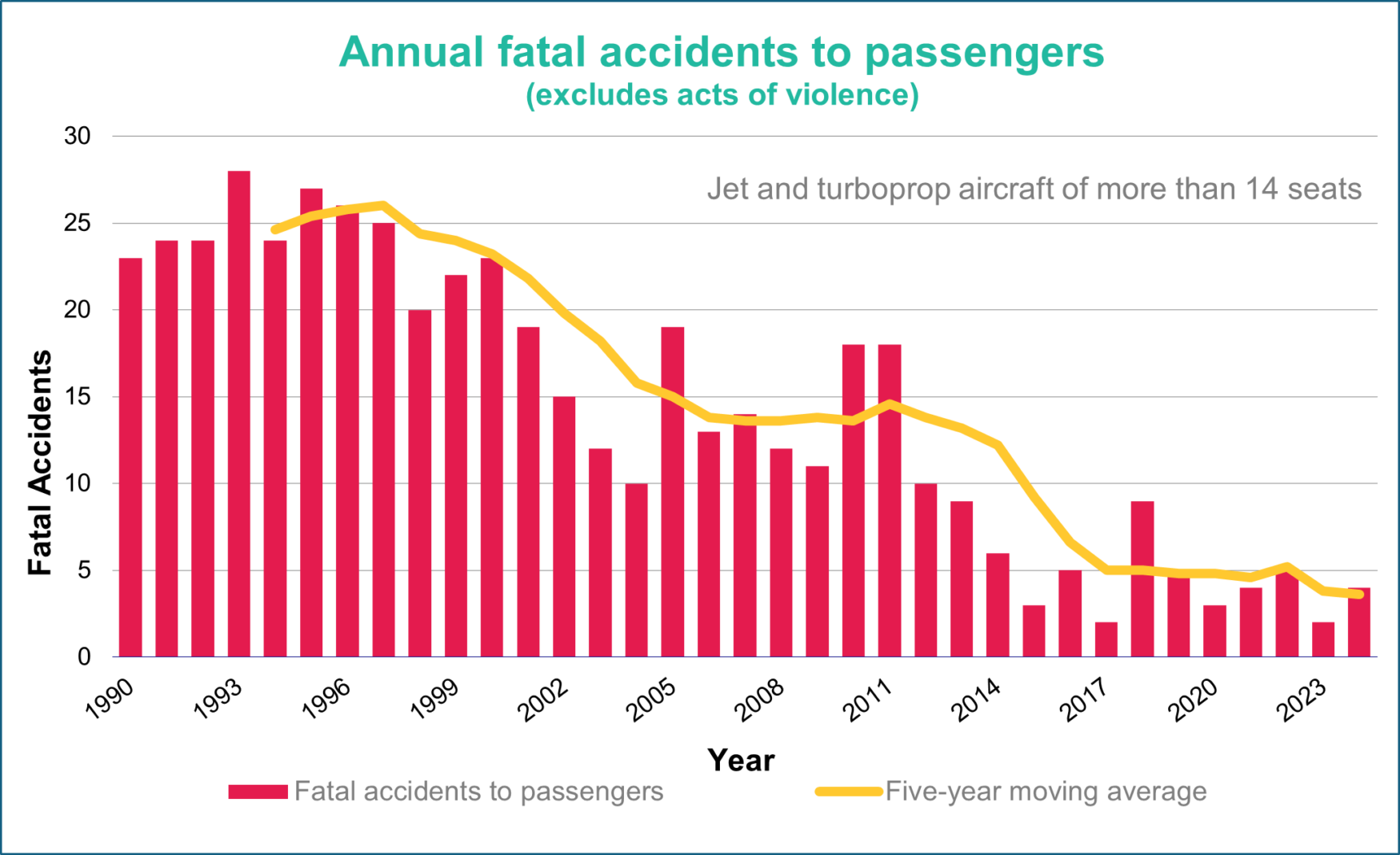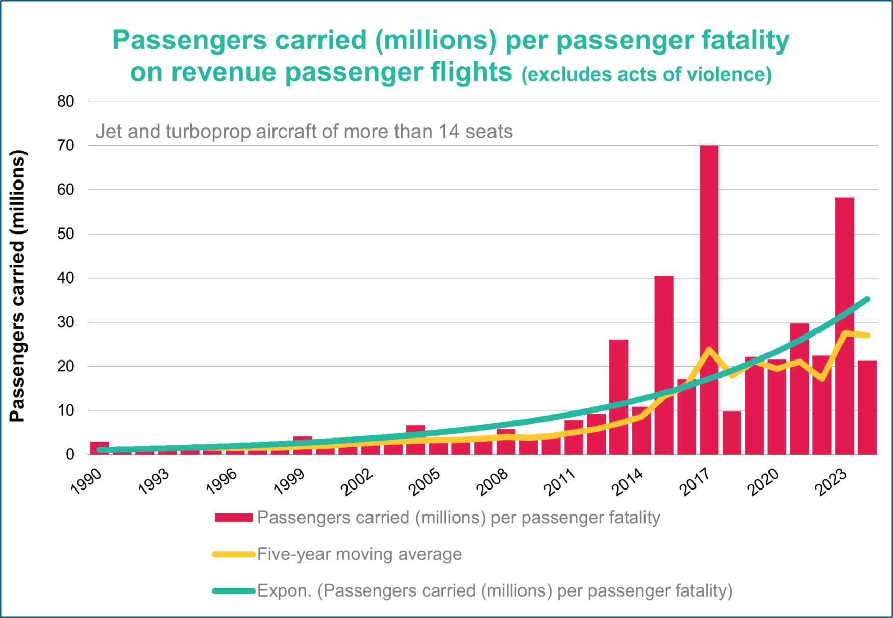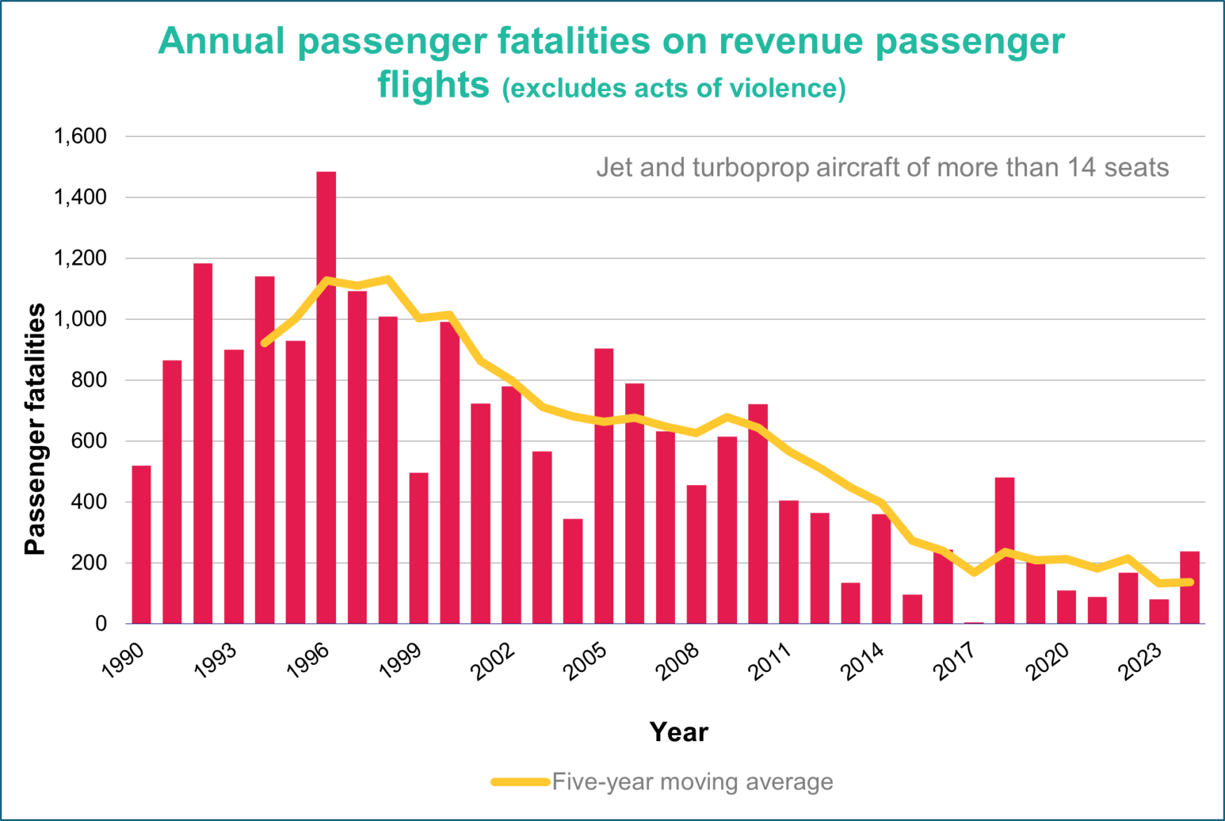 The annual average passenger fatality rate in the five years to the end of 2024 was one per 27 million passengers carried. This rate is more than twice as good as it was last decade (2010-19), when it was one per 12.9 million carried, and almost eight times better than in the 2000-09 decade of one per 3.5 million passengers carried. The passenger fatality rate in the 1990s was only one per 1.8 million carried.