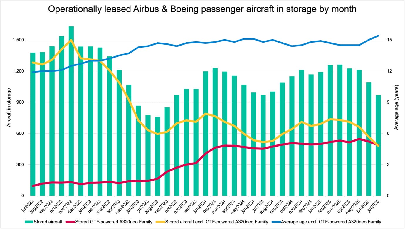 Excluding GTF A320neos, the average age of stored operating lessor aircraft has increased from 12 years in July 2022 to 15.4 years for the same month in 2025.