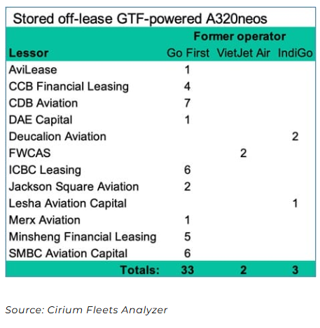 Fleets Analyzer reveals nine lessors have 33 stored GTF-equipped neos that were with Go First, while two had been operated by VietJet Air and three by IndiGo. Cirium Ascend Consultancy estimates there are only around 140 additional off-lease single-aisles of all types in storage, plus around 20 widebodies.