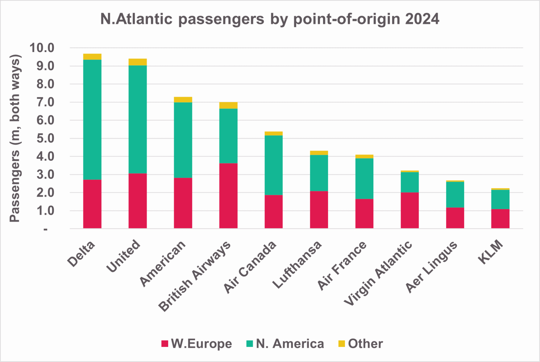 British Airways, KLM and Lufthansa each had more than 40% of passengers starting their journey on the opposite side of the Atlantic, while Air France posted a small majority. US majors carried higher shares of their own nationals, but still collectively with a third from Europe. Also worth noting that 4% of passengers came from other world regions.