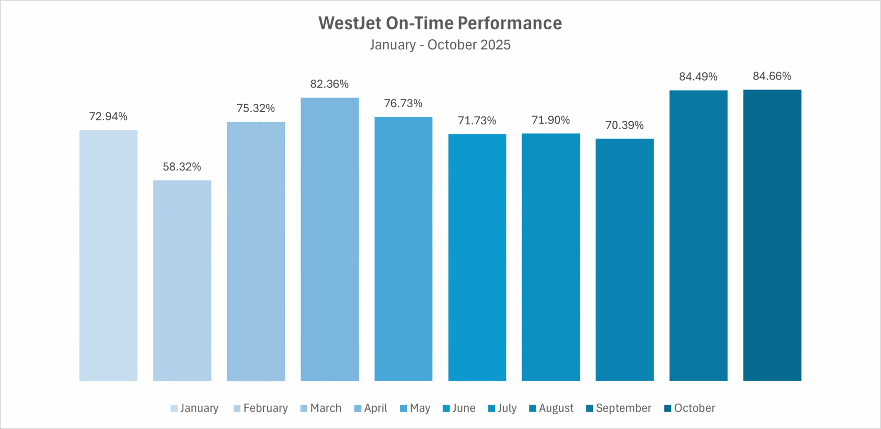 September’s numbers already showed momentum—roughly 84.5% OTP, putting WestJet among the month’s top performers. October confirmed it wasn’t a fluke.